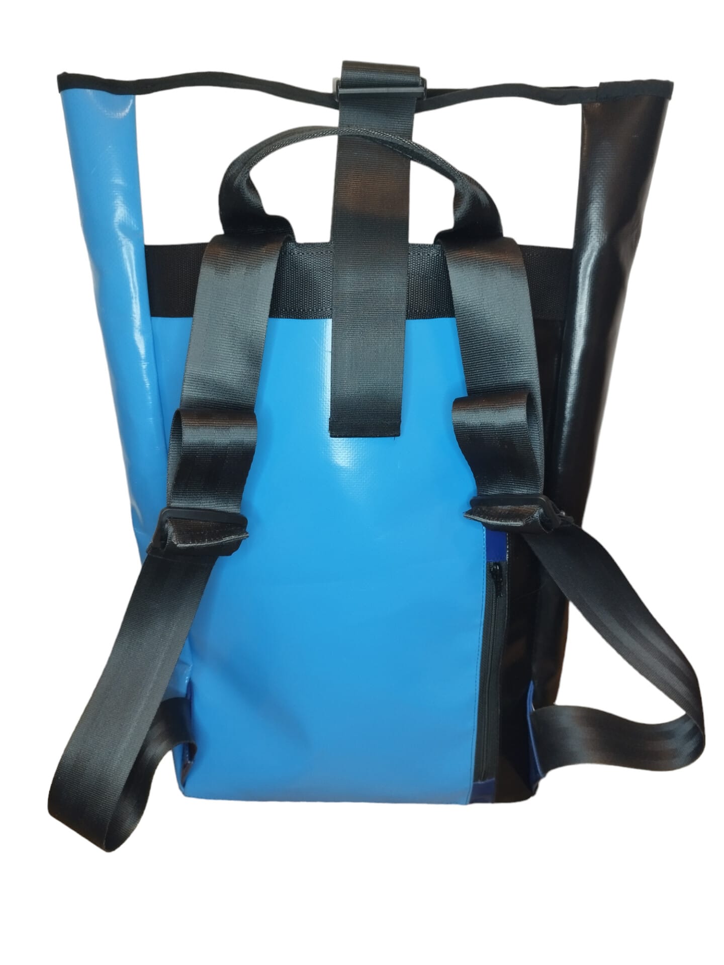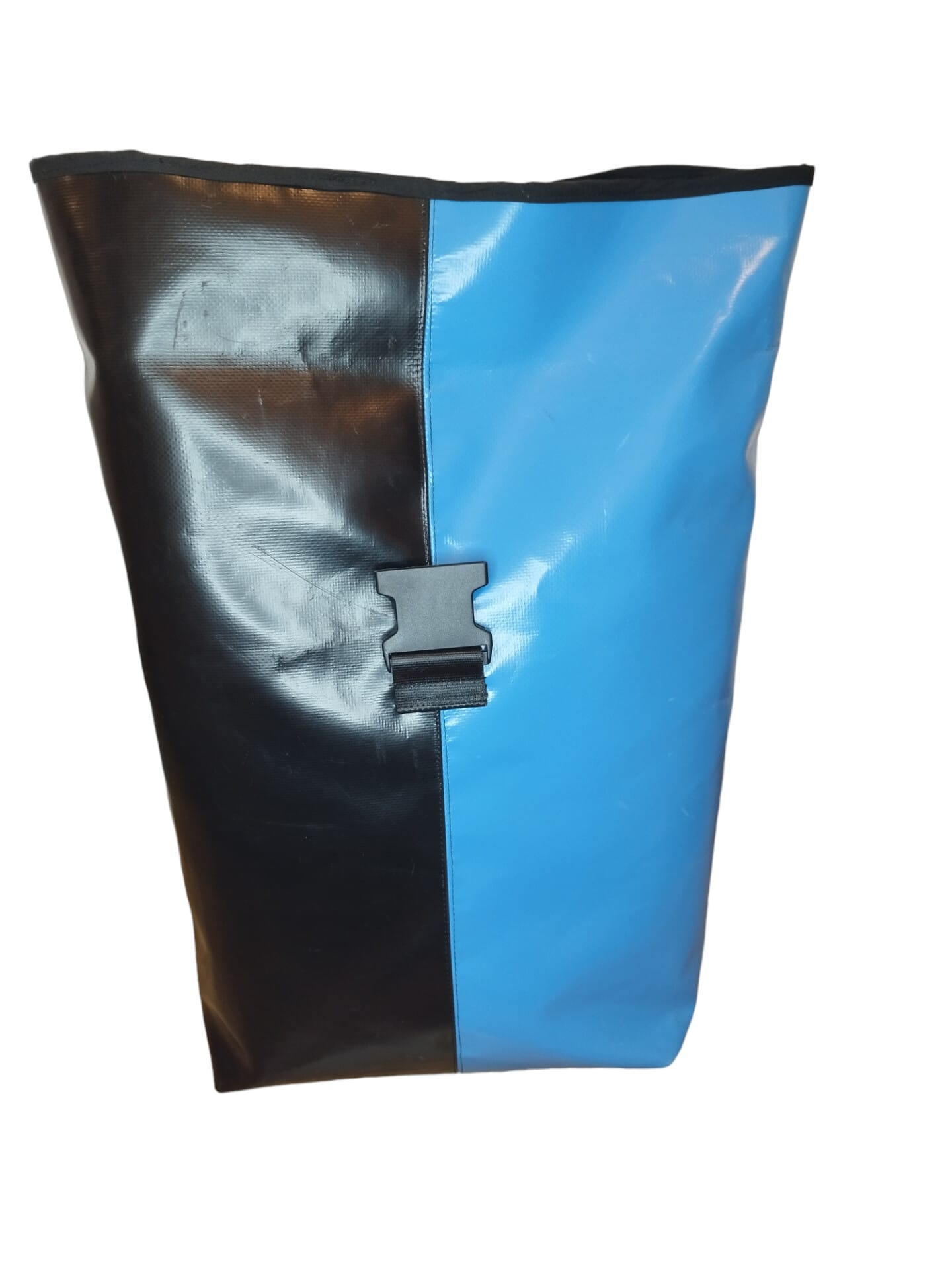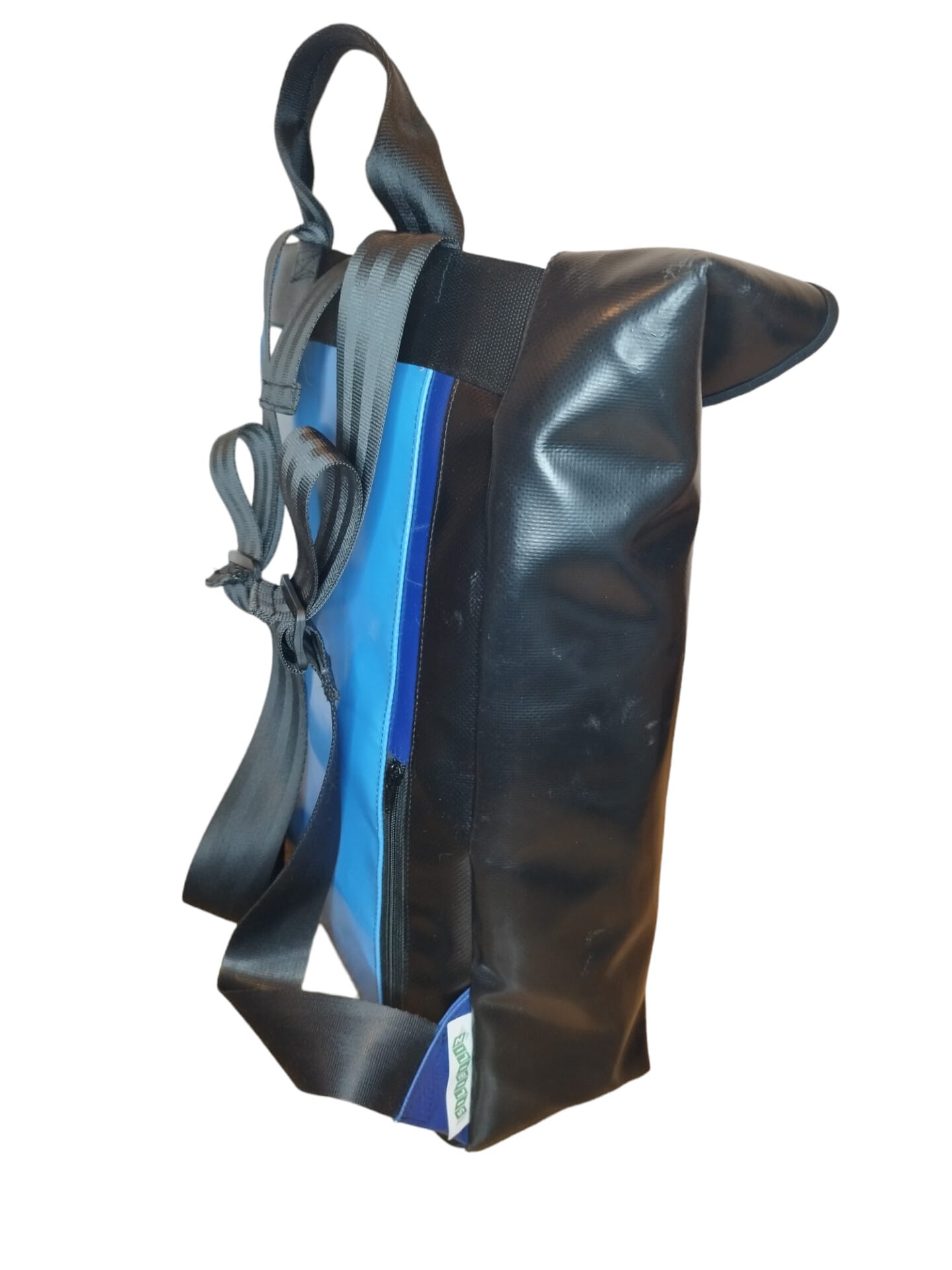 Un sac à dos « roll-top » upcyclé (en bâches de camion et ceintures de sécurité), unique et ultra-solide qui t’accompagnera partout pendant très très longtemps!