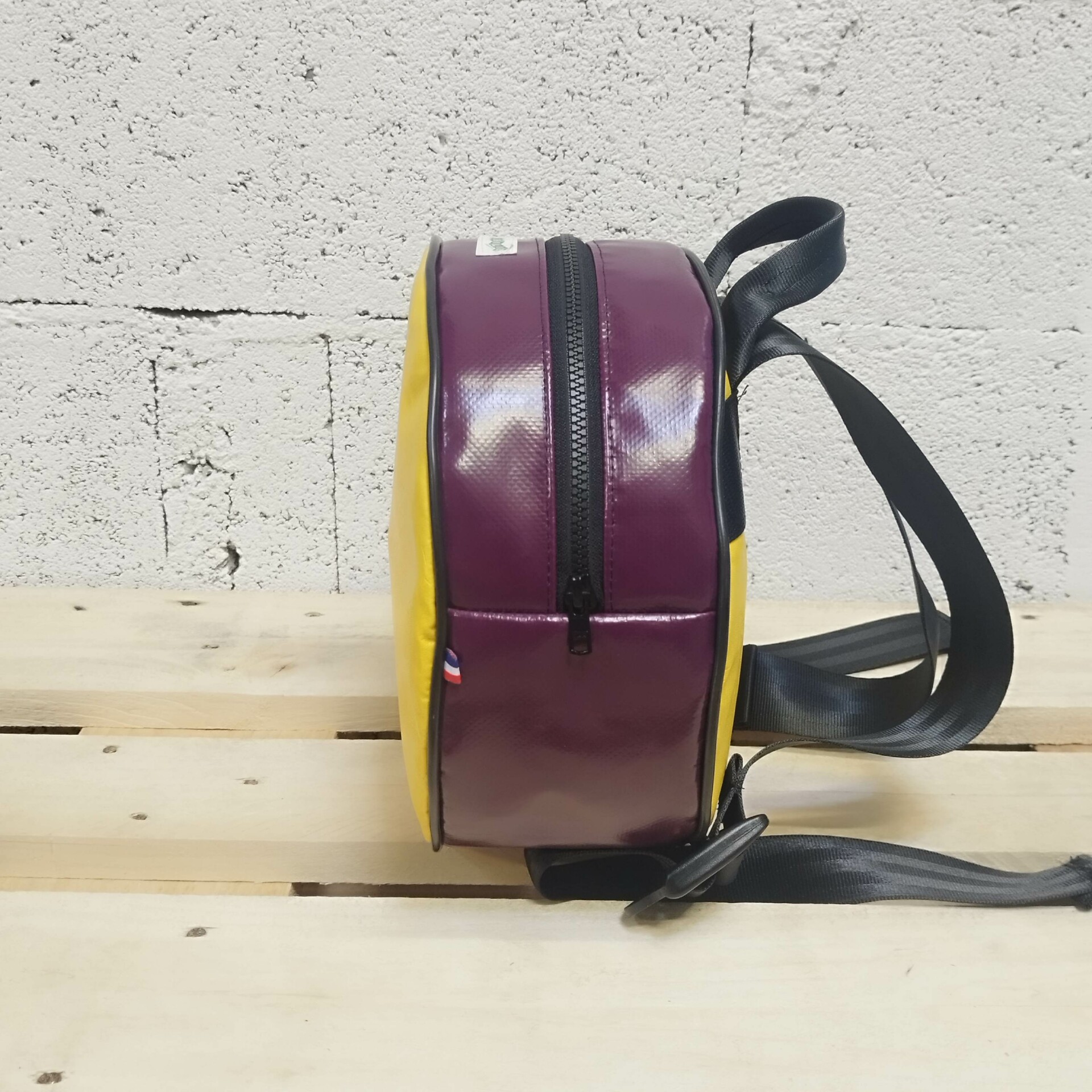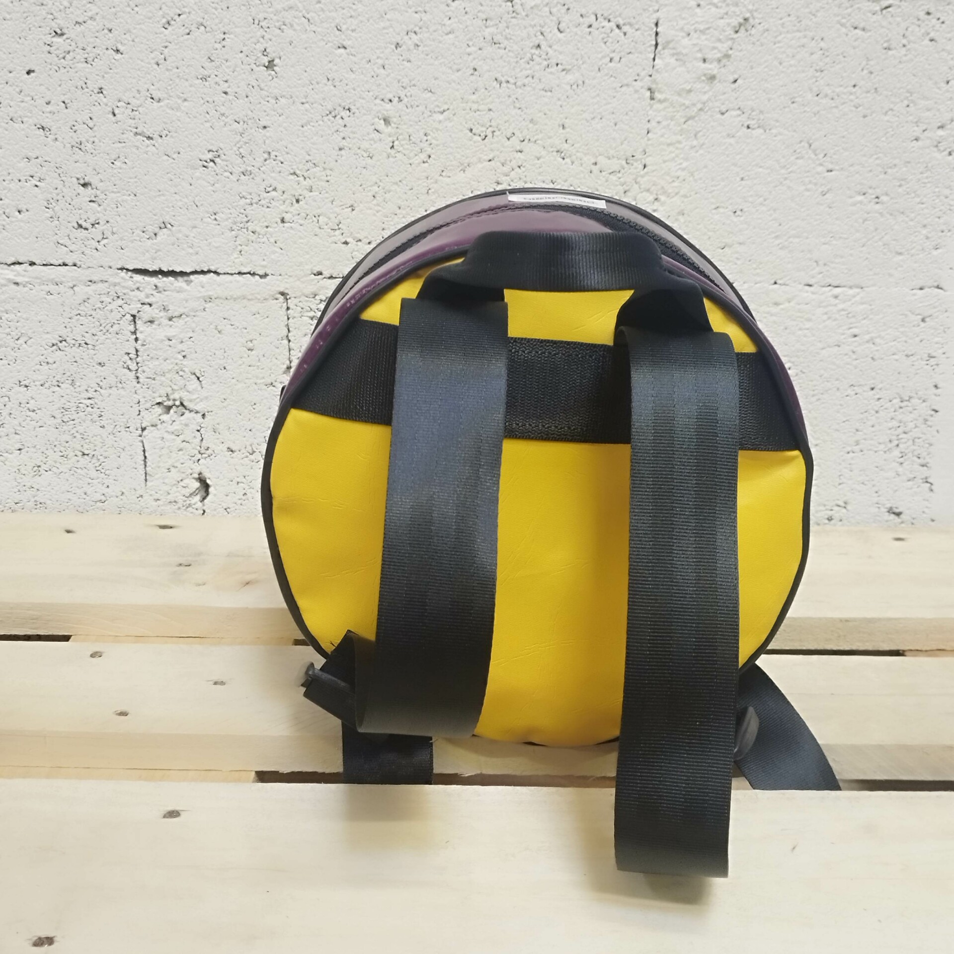 Un sac à dos tout rond en bâches de camion et ceintures de sécurité), unique et ultra-solide qui t’accompagnera partout pendant très très longtemps!