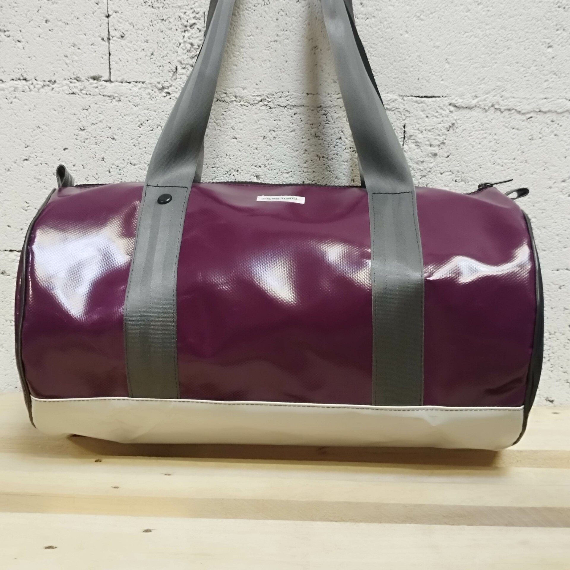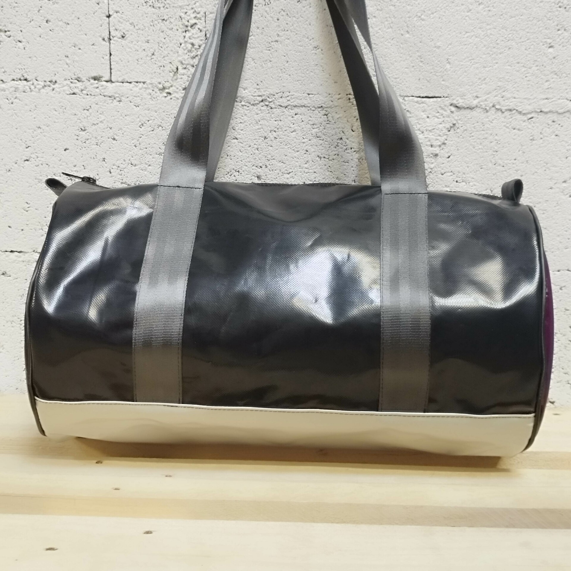 Sac de sport Polochon de 30L en bâches de réemploi et ceinture de sécurité automobile.