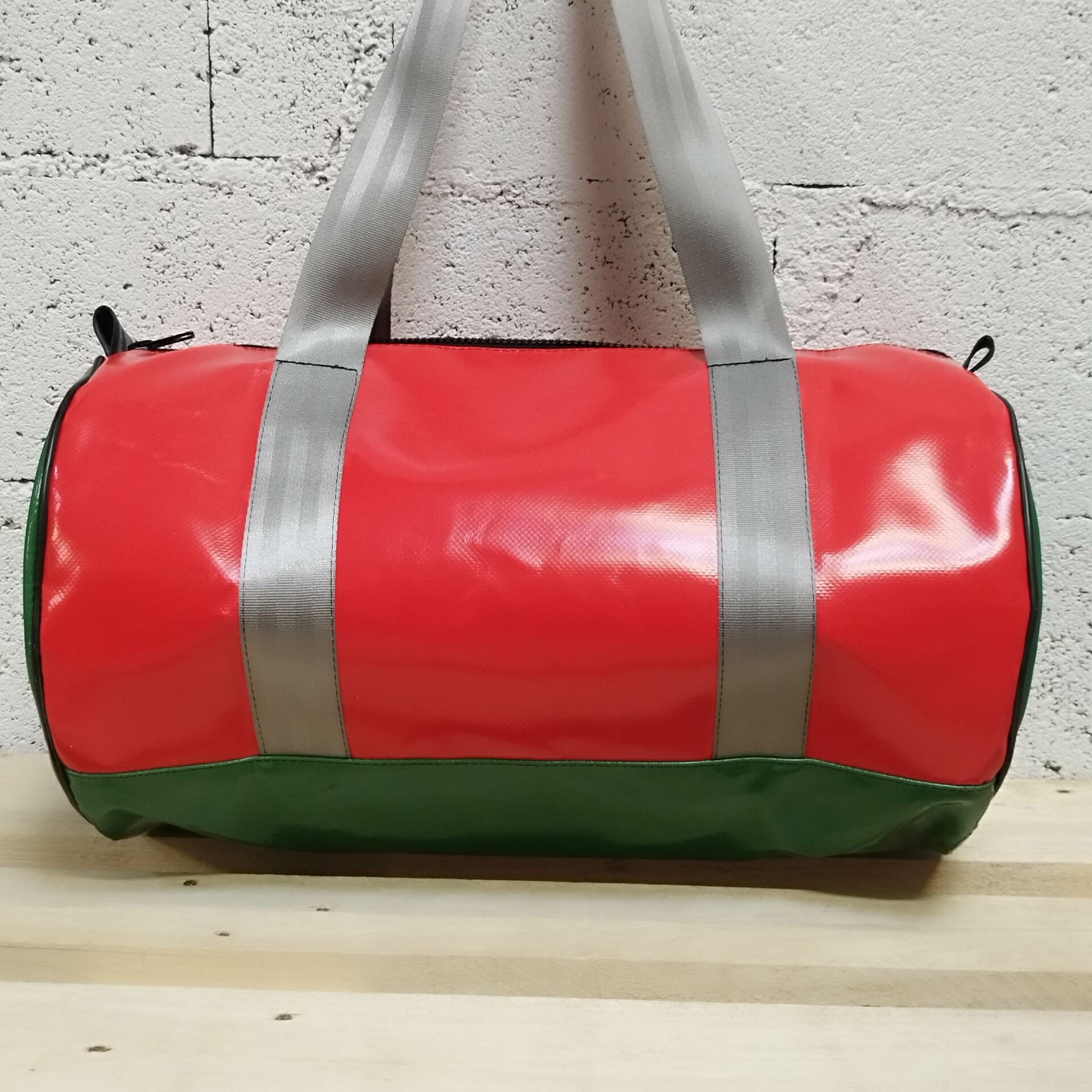 Sac de sport Polochon de 30L en bâches de réemploi et ceinture de sécurité automobile.