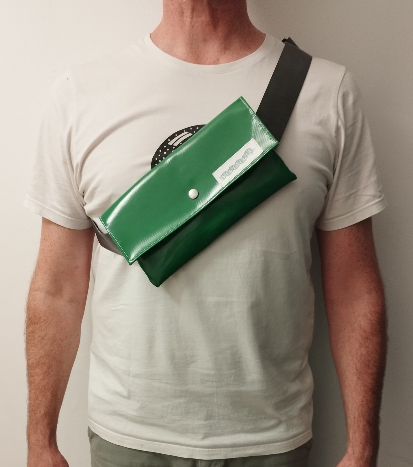 Nous utilisons des matières récupérées : bâches publicitaires, voiles de kite, textiles techniques, chutes d’ateliers.