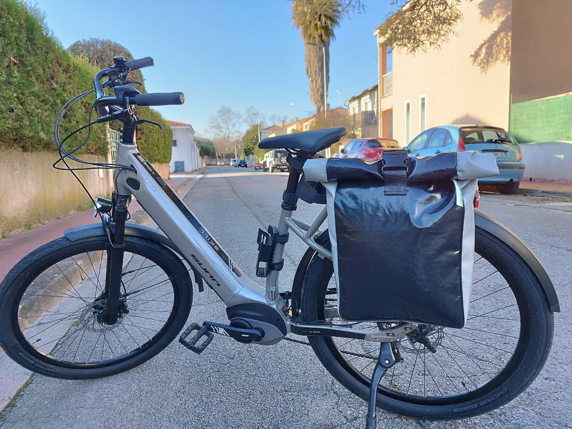 Sacoche de vélo « roll-top » en bâche de camion et ceinture de sécurité. Sacoche résistante et imperméable qui vous accompagnera aussi bien dans vos trajets vélotaf que dans vos escapades à la campagne.